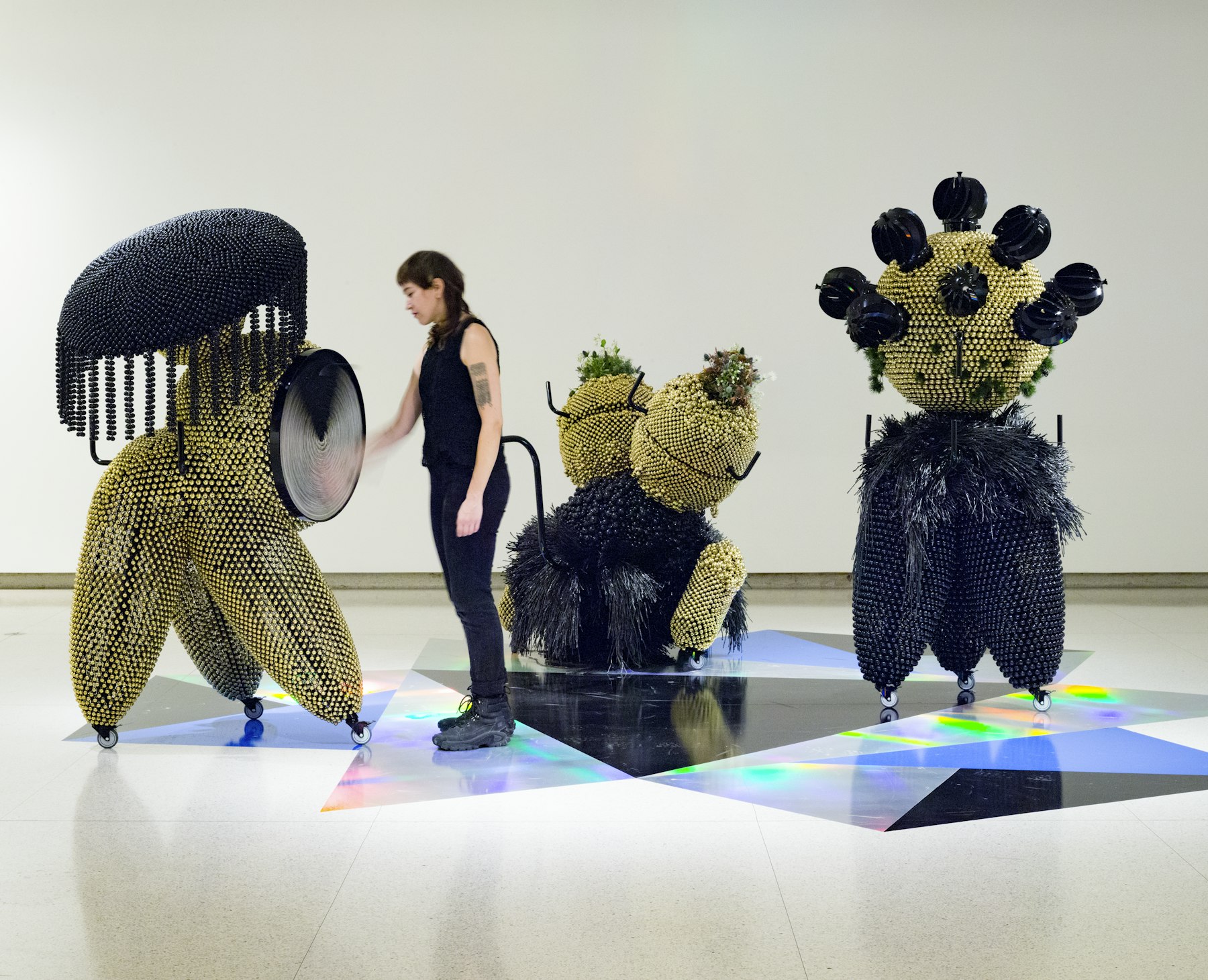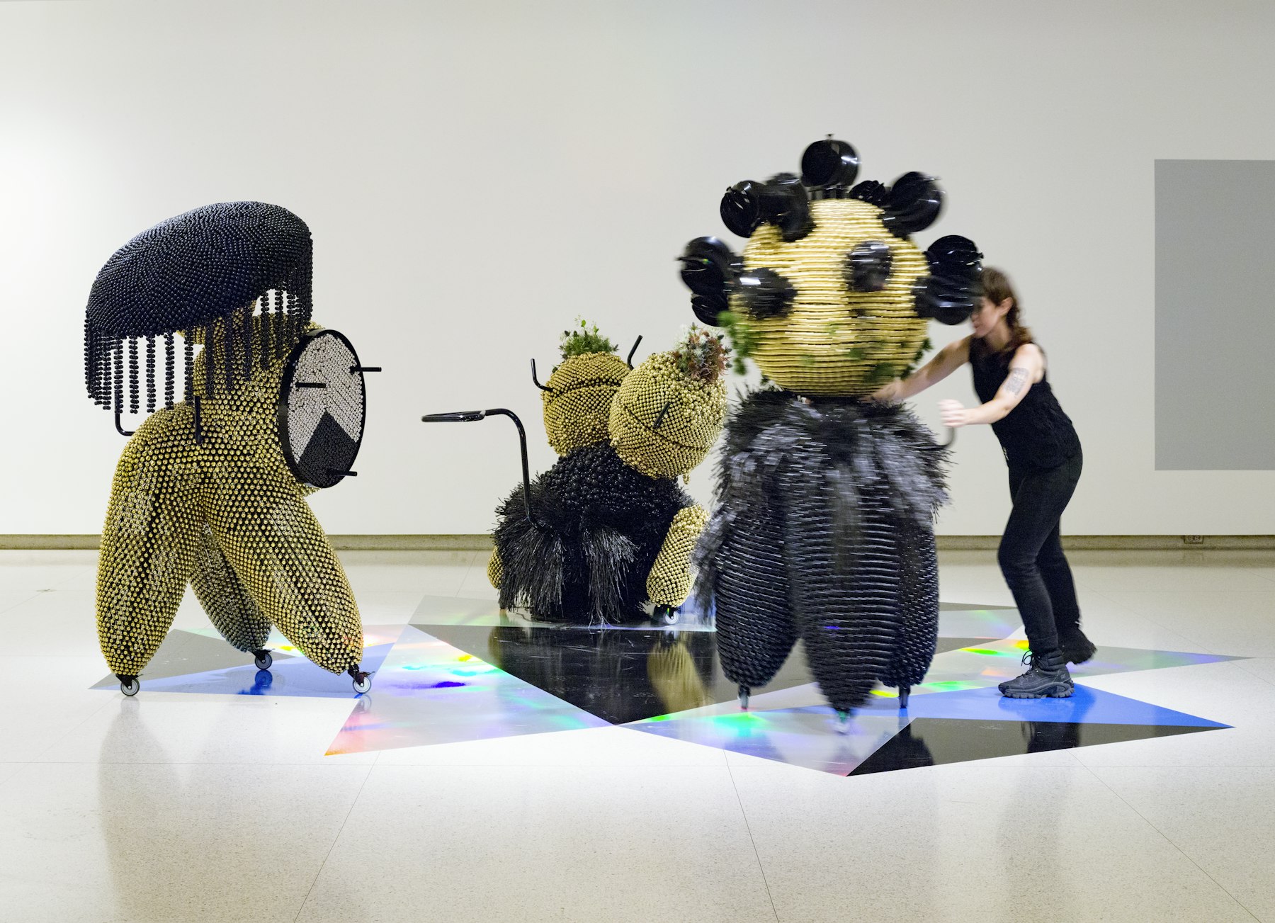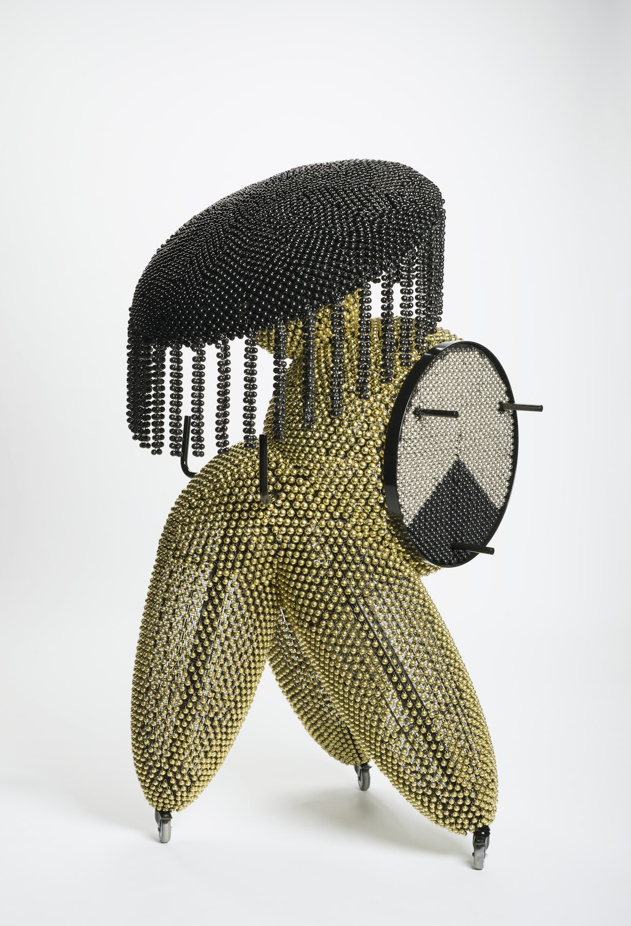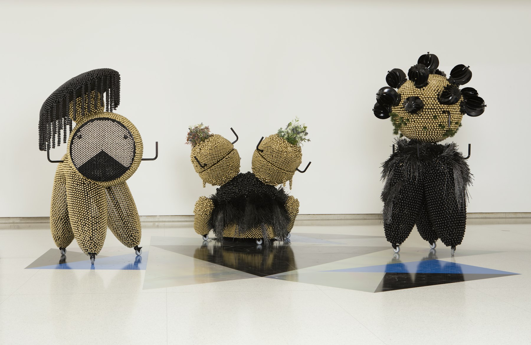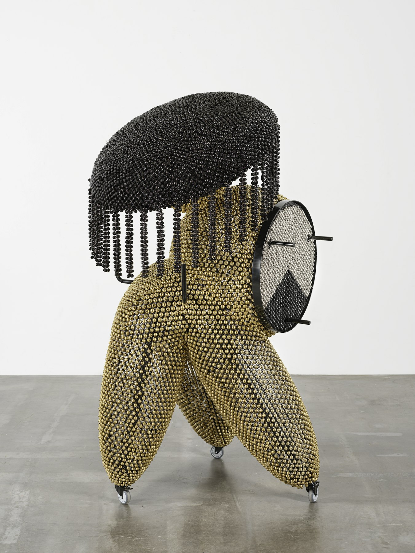 - powder-coated steel and handles, casters, nickel and brass plated bells, metal rings, plastic twine, turbine vents, artificial plants, pine cones, foam