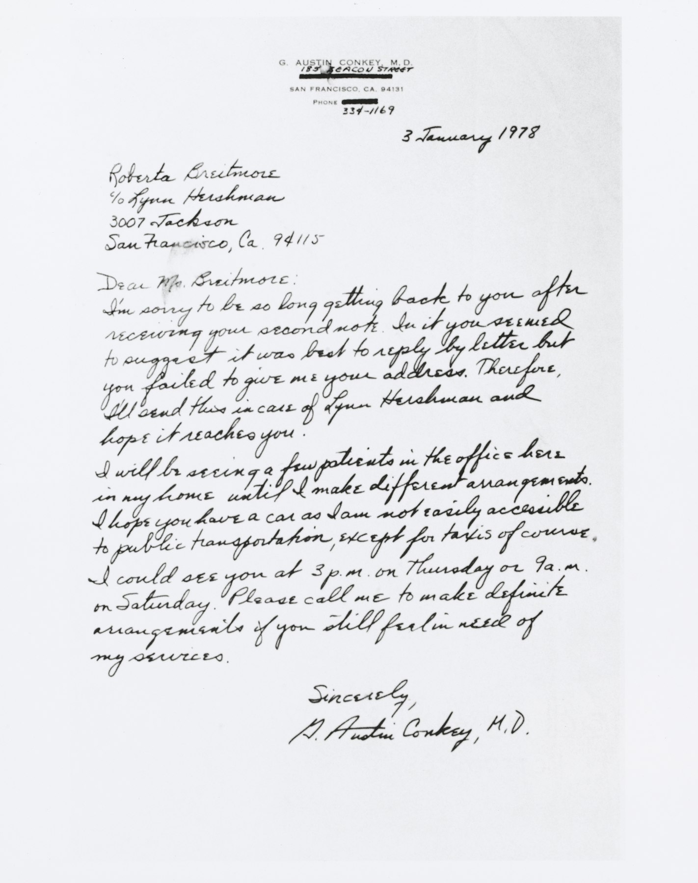 - untitled from Roberta's Internal Transformations: Language from Roberta [letter c/o Lynn Hershman to Roberta Breitmore]