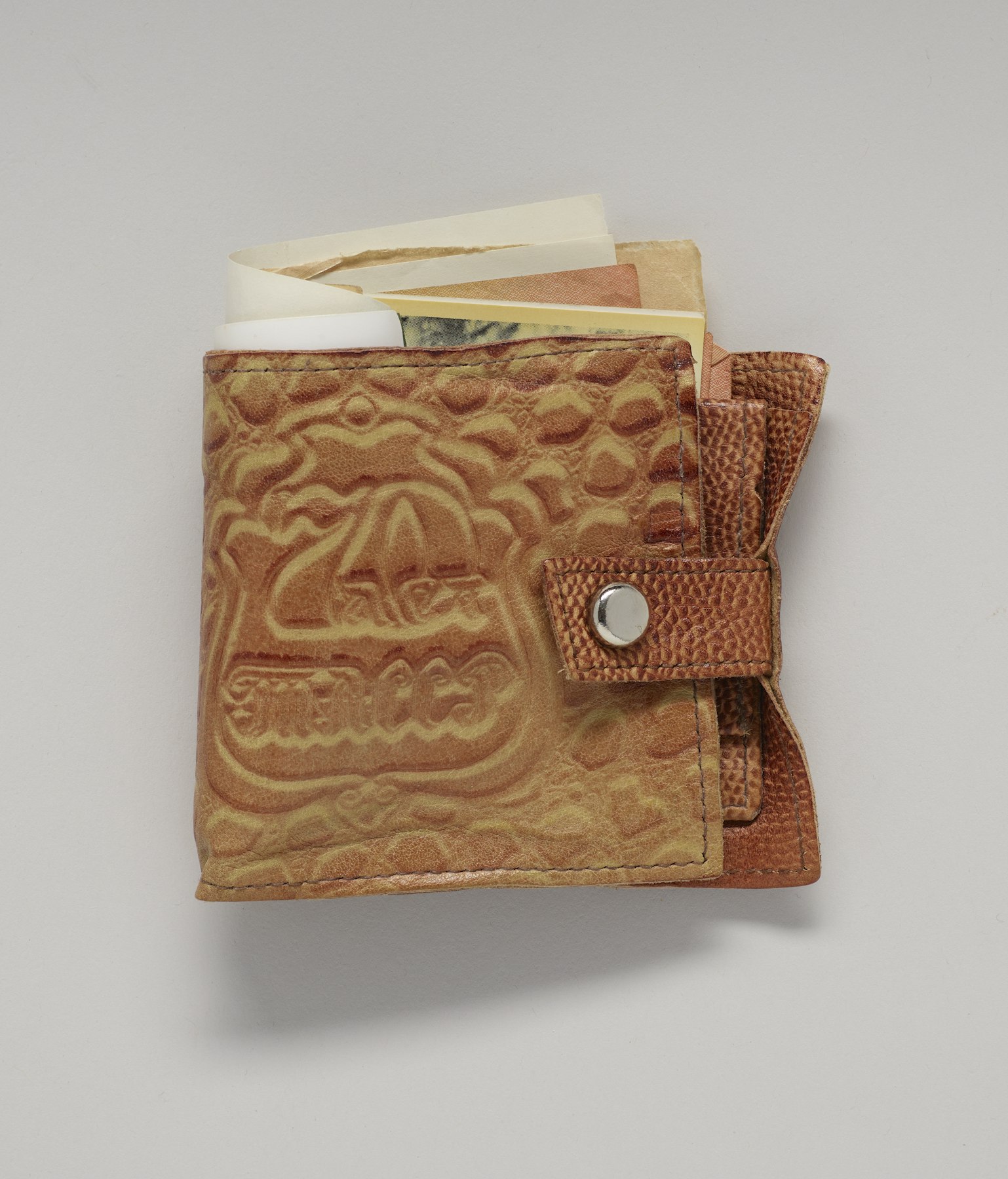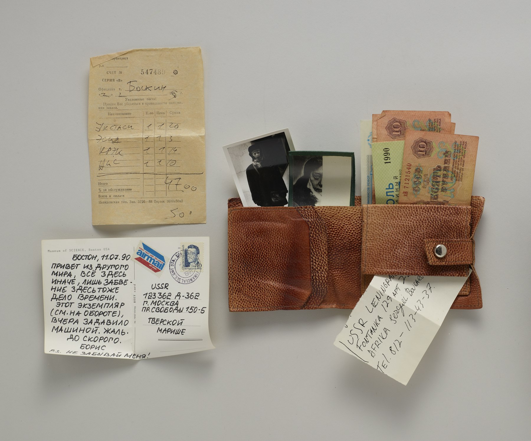 - cardboard box, tissue paper, leather, paper, photograph, metal coins, throat lozenge