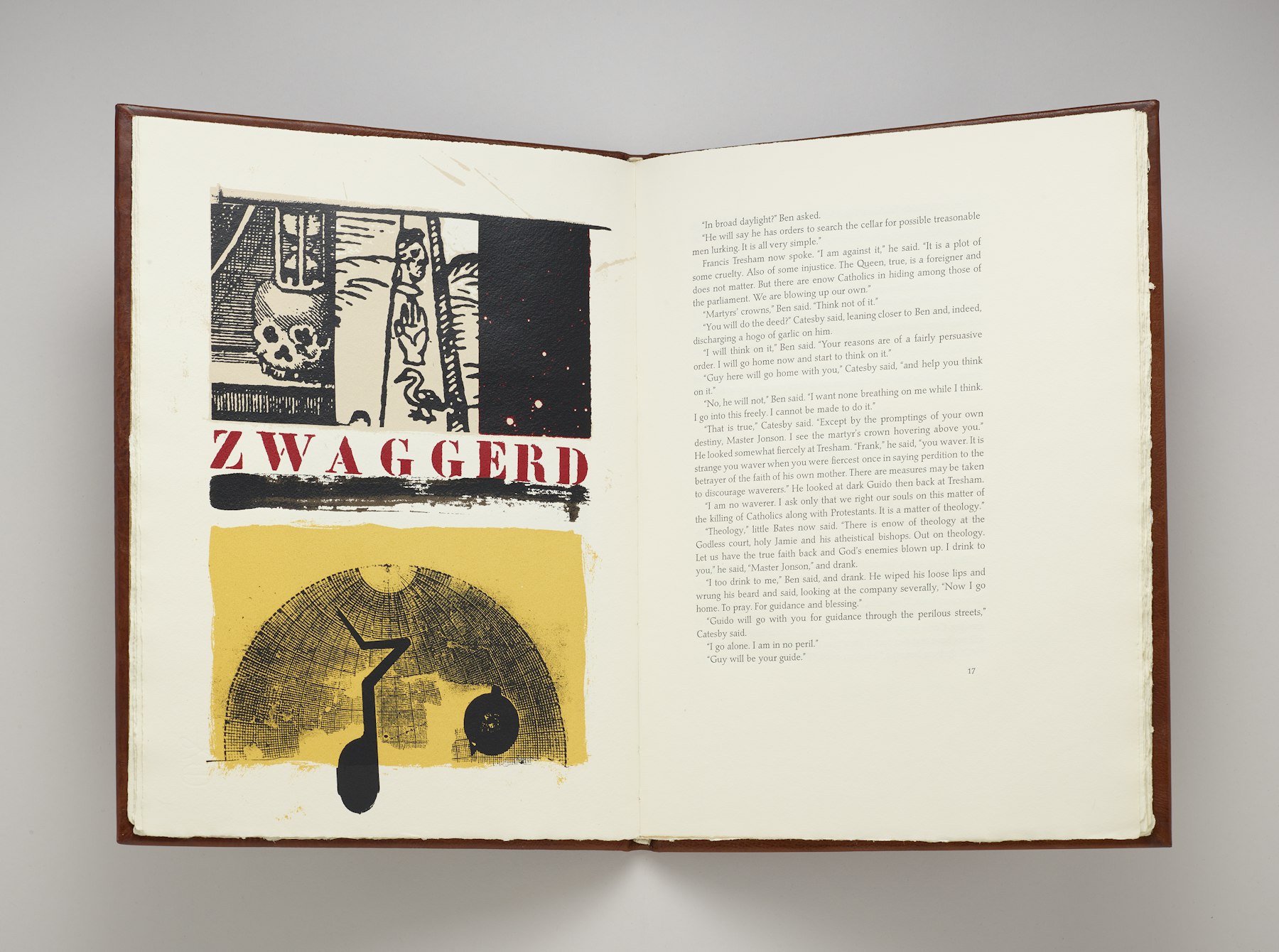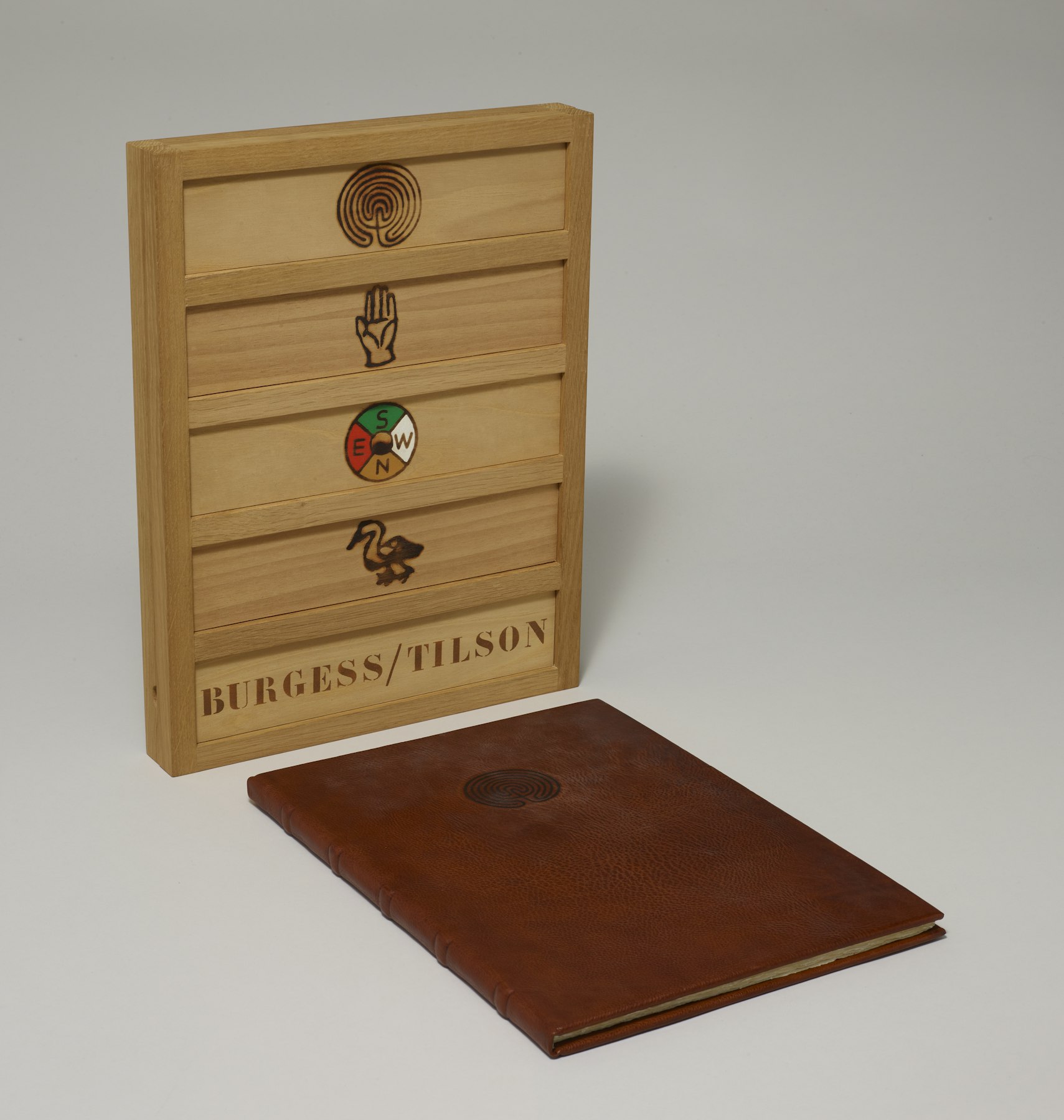 - screenprint, letterpress on paper in silk-lined box with burned wood design