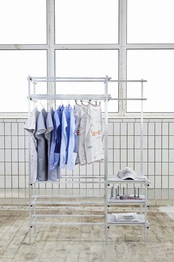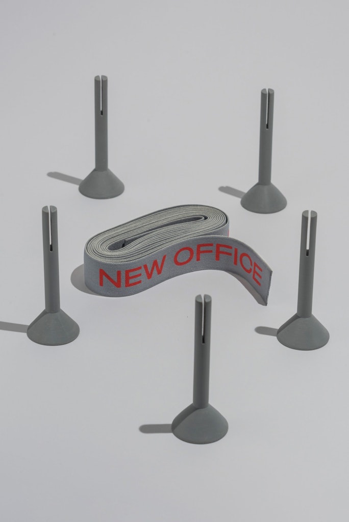 Zimmermann’s graphic system playfully references the traditional office, and her witty series of objects includes a fake shirt for video calls, a reversible vest with a “free” and a “busy” side, and a barrier to mark a freelancer’s working area in a shared working space.