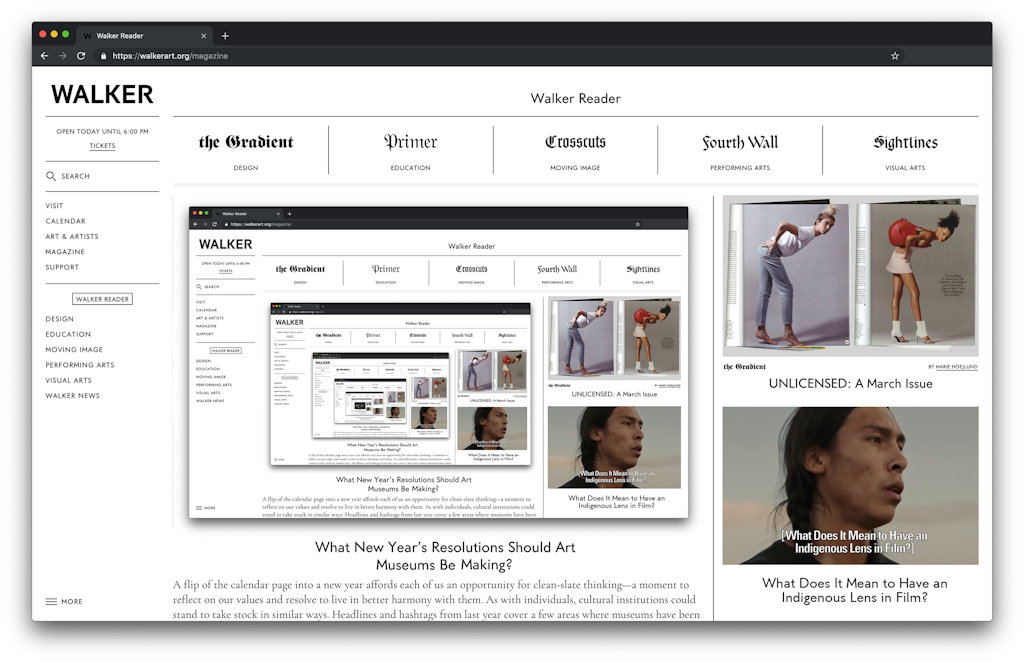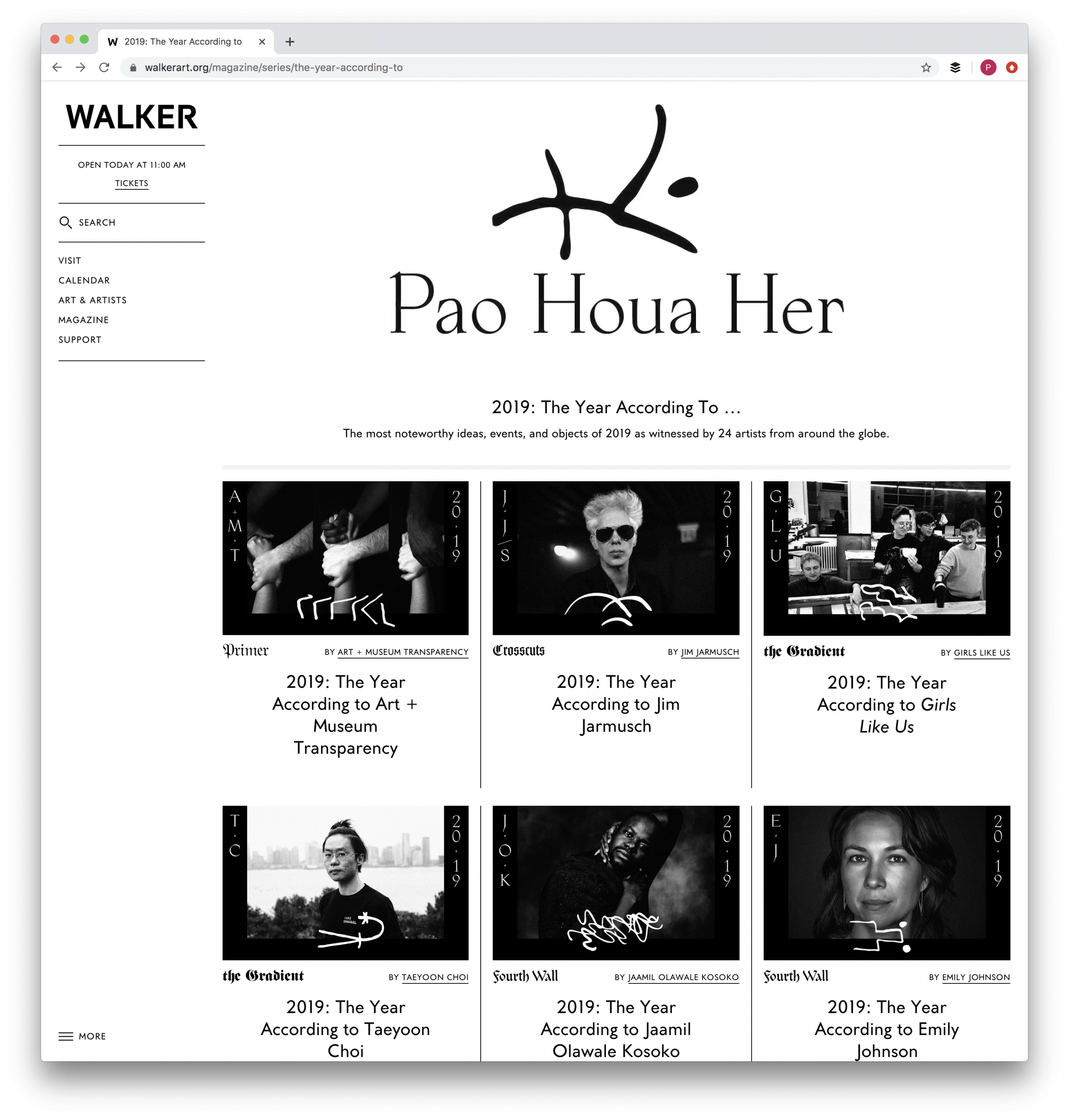 The New Year’s reset moment offered me a chance to stop the treadmill of deadlines, momentarily, to reflect on what we did here at Walker Reader over the past year: what worked (or didn’t) and what efforts show promise as we continue to develop our thinking about the role of digital publishing in the cultural sphere. While we have hard metrics to gauge how we did—we published 175 pieces of original content in 2019, featured 100 commissioned writers from around the globe (55 percent of whom identify as people of color) in addition to our own staff contributors, and earned nearly 640,000 pageviews—it’s the softer considerations I’m most interested in today’s lookback. How did Walker Reader help us live up to our mission of connecting artists and audiences and examining “the questions that shape and inspire us as individuals, cultures, and communities”? Where did we see innovation in how we approach online discourse about art today? Where were we brave, or creative, or unexpected in our publishing? Where was the writing strong? And, what just felt right?