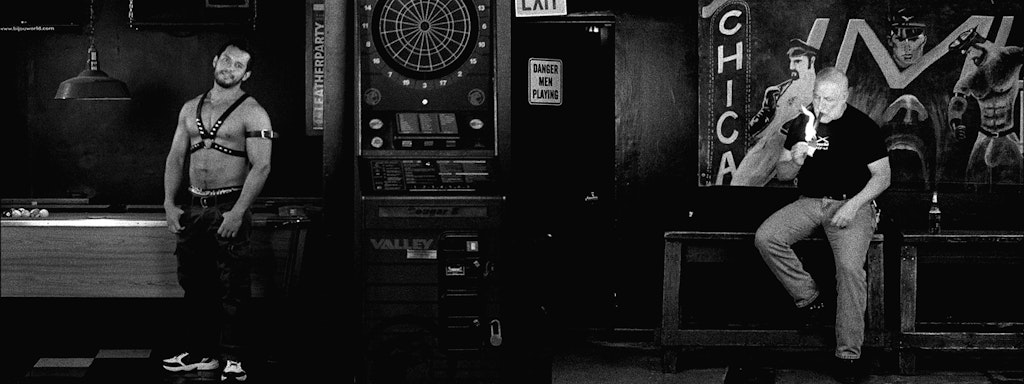 Filmed at Touché, Chicago’s oldest leather bar, Frédéric Moffet’s The Faithful projects portraits of men on facing walls, as if they’re cruising each other from opposite sides of a virtual bar. The two-channel, looped installation will be featured in the Garden Terrace Room on June 22 as the Walker’s Total Pride event. A Chicago-based filmmaker and artist, Moffet talks with Bentson Archivist/ Programmer Ruth Hodgins about the filming of The Faithful, leather bars, and the culture of cruising.