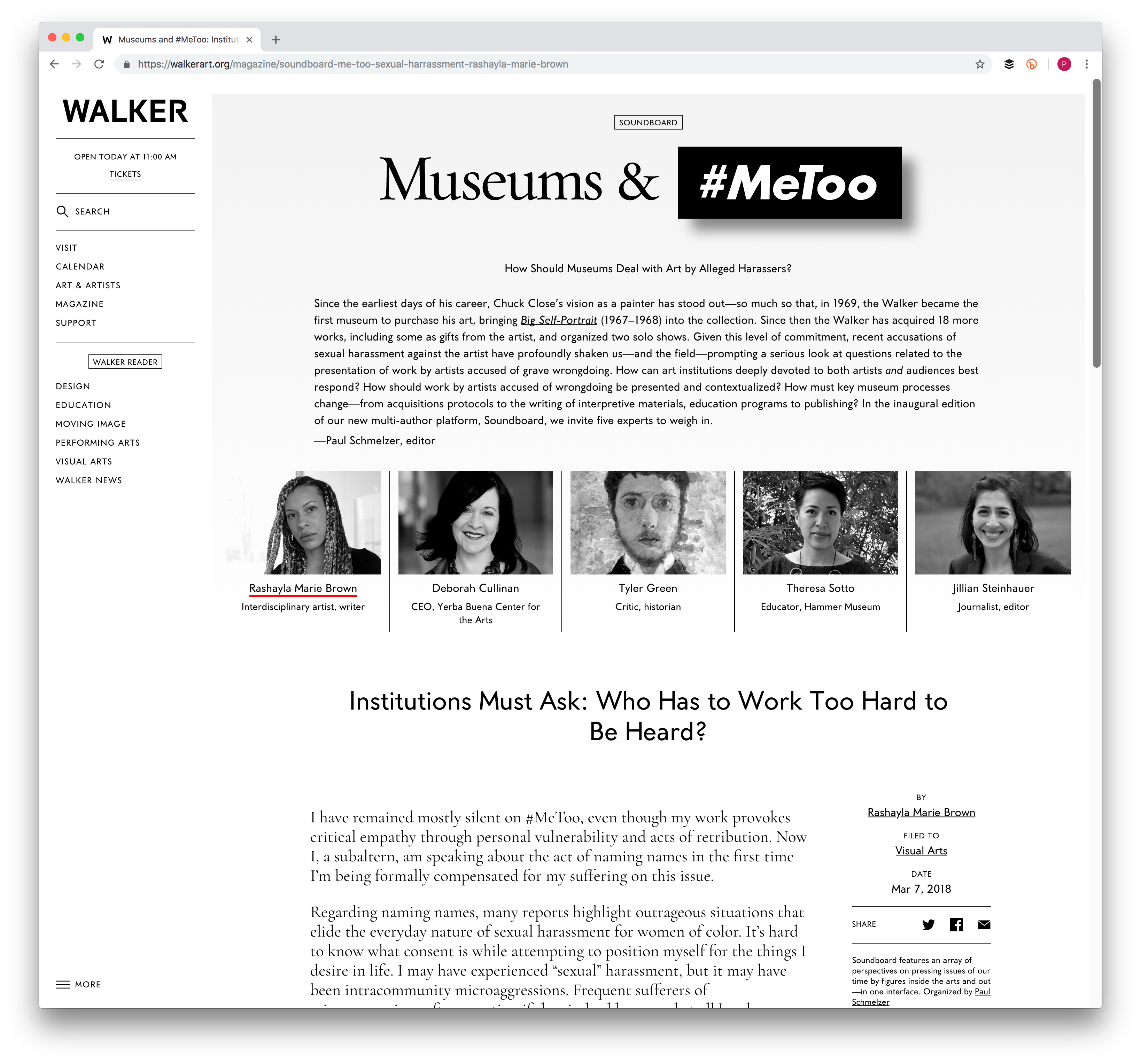 It’s only through a multiplicity of voices, I believe, that contemporary art museums can be truly contemporary. So one of my favorite moments of the year was the launch of Soundboard. Inspired in part by the New York Times’s late, great “Room for Debate” feature, it gives us a way to tackle pressing questions in art and culture through a diversity of voices using a single interface: just click a headshot to refresh the text for each writer. The first edition featured five thinkers weighing in on a question on many minds in the art world this year: what should art museums consider when artists they support are accused of wrongdoing? Our “Museums & #MeToo” piece was sparked by allegations of sexual harassment against Chuck Close, an artist with close ties to the Walker. Soundboard 2.0 offered a quartet of writings, guest edited by Nicole Killian, for our design vertical The Gradient, looking at what a queering of design education would look like. Our third edition invited four artists with close links to the immigrant experience to consider news coverage of the Trump administration’s “zero tolerance” immigration policy when answering the slightly-loaded question, “What can art do that journalism can’t?” The project feels so perfectly on mission for a questioning—and publishing—art institution like the Walker.