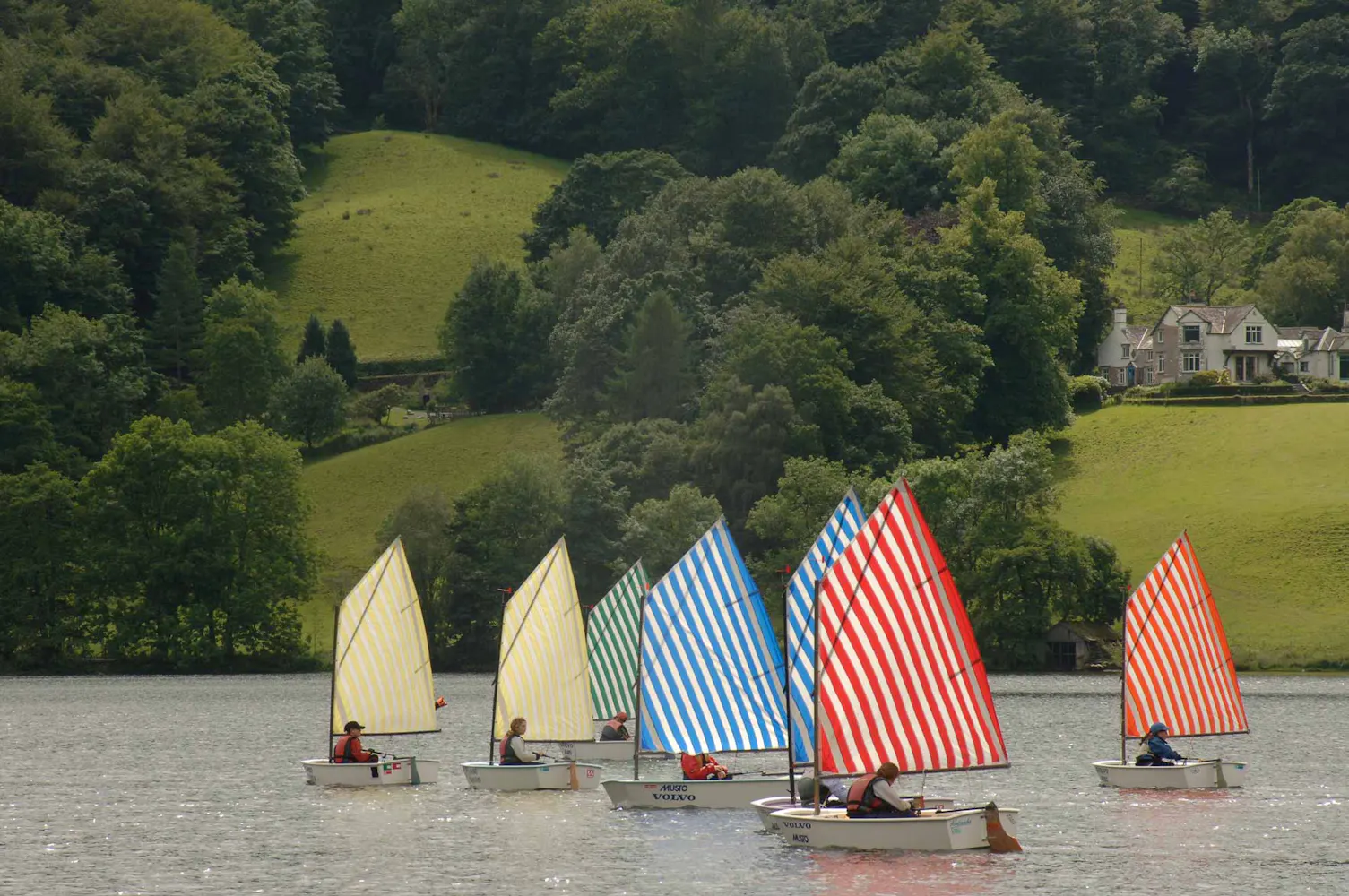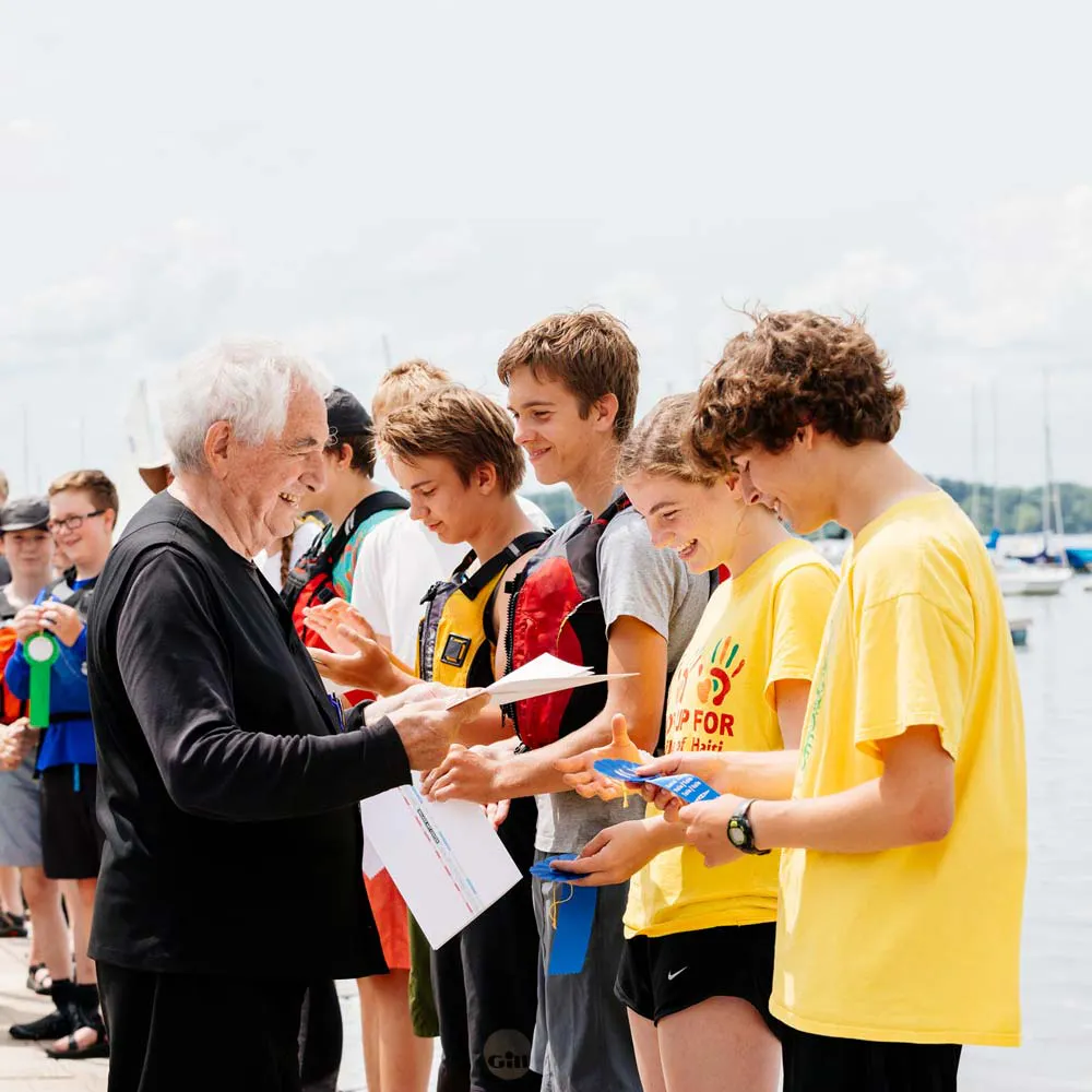Tacking and jibing in a zigzag pattern, 18 teen sailors worked in pairs as skipper and crew. The race lasted for more than an hour.