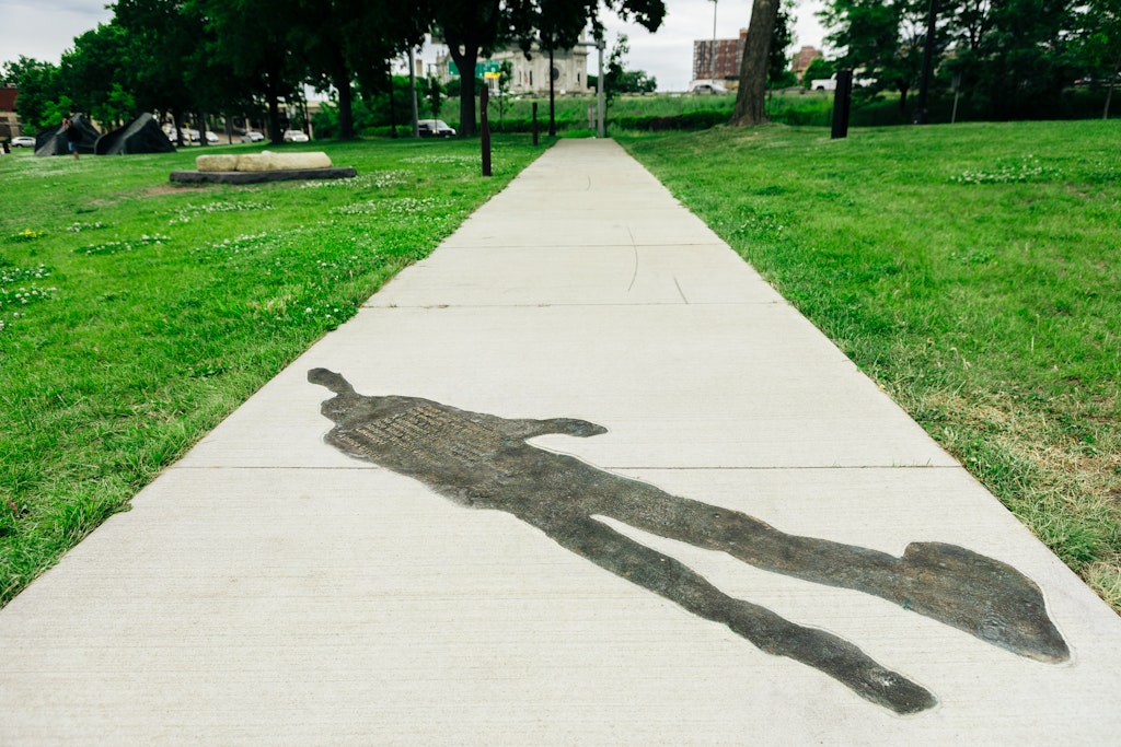 The final sculpture—dedicated to Kirk Washington, Jr. is the most ephemeral of the group. It was created by spraying a water-resistant material directly onto the concrete. The result is invisible when dry, but when it rains the silhouette contrasts with the surrounding concrete which is darkened by the rain.